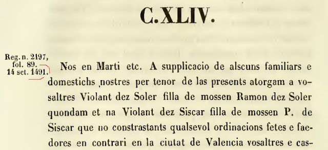 Nos en Marti etc. A supplicacio de alscuns familiars e domestichs nostres per tenor de las presents atorgam a vosaltres Violant dez Soler filla de mossen Ramon dez Soler quondam et na Violant dez Siscar filla de mossen P. de Siscar que no constrastants qualsevol ordinacions fetes e faedores en contrari en la ciutat de Valencia vosaltres e cascuna de vos portants la nostra empresa de la correge la qual ab aquesta matexa vos atorgam puscats portar perles pedres fines draps daur e de seda e tots altres arreaments queus volrets de qualsevol preu o valor sien vosaltres empero portants la dita nostra empresa e no en altra manera. Manants per aquesta matexa de certa sciencia e expressament sots incorriment de nostra ira et indignacio e encara pena de mil morabetins dor a nostres cofres aplicadors als governador justicia mostaçaf jurats e tots altres officials de la dita ciutat de Valencia presents e sdevenidors e a lurs lochtinents que la present licencia a vosaltres abdues e a cascuna de vos tinguen e observen e noy contravinguen per alguna rao. En testimoni de la qual cosa vos manam esser feta la present segellada ab lo nostre segell.